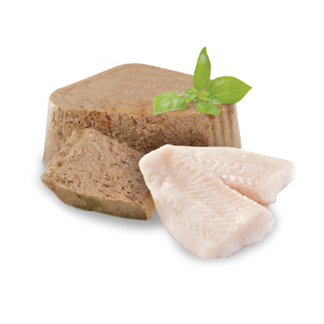 Ingredientes: carne y derivados de cerdo (hígado, pulmón, bazo) y/o, pollo (retazo, hígado, corazón), y/o aves de corral (retazo), agua suficiente para el proceso, pescado blanco y sus derivados (cabezas y aletas), aditivos técnicos (goma xantana, carragenina, goma de algarrobo, goma guar, algarrobo), agente palatante (glicina), vehículos (harina de maíz, sepiolita, mezclas naturales de esteatita y clorita, ácido silícico), conservador (nitrato de sodio), minerales (carbonato de calcio), azúcares (dextrosa), derivados de origen vegetal (achicoria), aditivos nutricionales (vitamina E, taurina, sulfato de zinc monohidratado, vitamina B1, sulfato de manganeso monohidratado, sulfato de cobre pentahidratado, yodato de calcio anhidro).