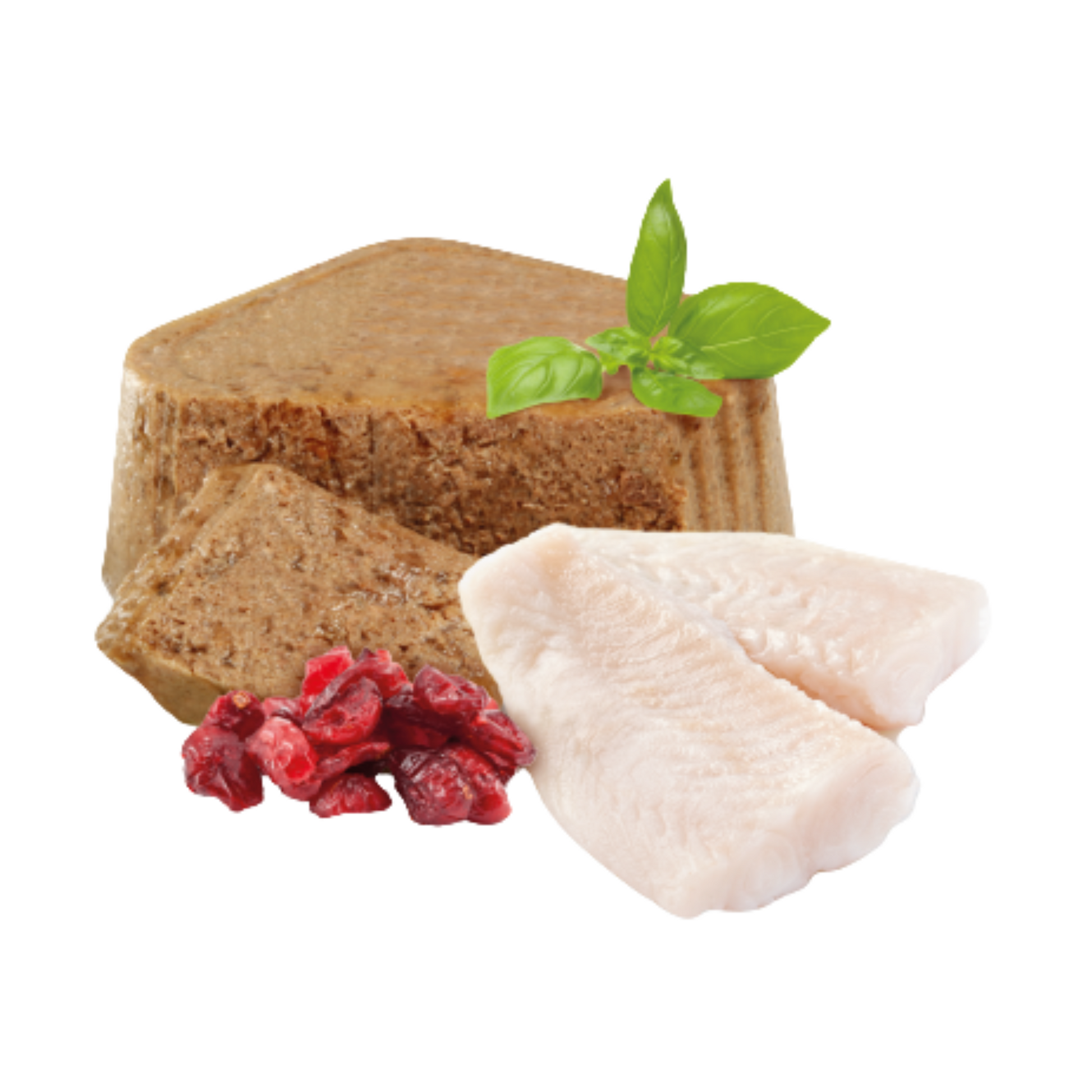 Ingredientes: Agua suficiente para el proceso, carne y derivados de ave de corral (retazo) y/o cerdo (hígado, pulmón, bazo), pescado blanco y sus derivados (cabezas y aletas), aditivos técnicos (algarrobo, goma xantana, carragenina, goma de algarrobo, xantana), agentes palatantes (glicina), frutas: arándano, minerales (carbonato de calcio, cloruro de potasio, carbonato de sodio), vehículos (harina de maíz, sepiolita, mezcla natural de esteatita y clorita, ácido silícico, sipernat), conservadores (nitrato de sodio), varios azúcares (dextrosa), aditivos nutricionales (taurina, vitamina E, DL metionina, sulfato de zinc monohidratado, vitamina B1, sulfato de manganeso monohidratado, biotina, sulfato de cobre pentahidratado, yodato de calcio anhidro).