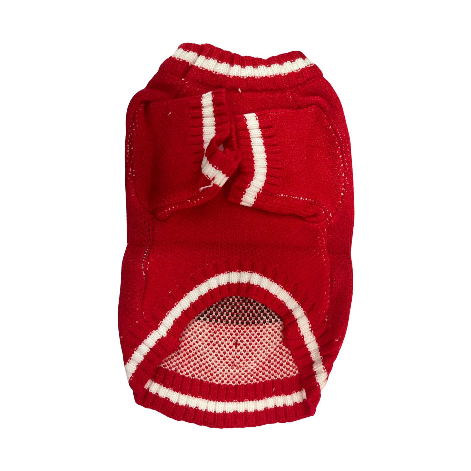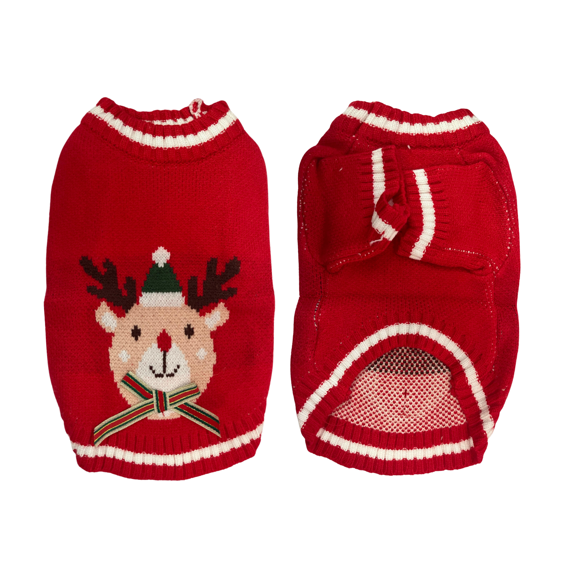 Suéter navideño para mascotas en color rojo con diseño de reno, ideal para mantener a tu peludito abrigado durante la temporada festiva con un estilo tierno y encantador.