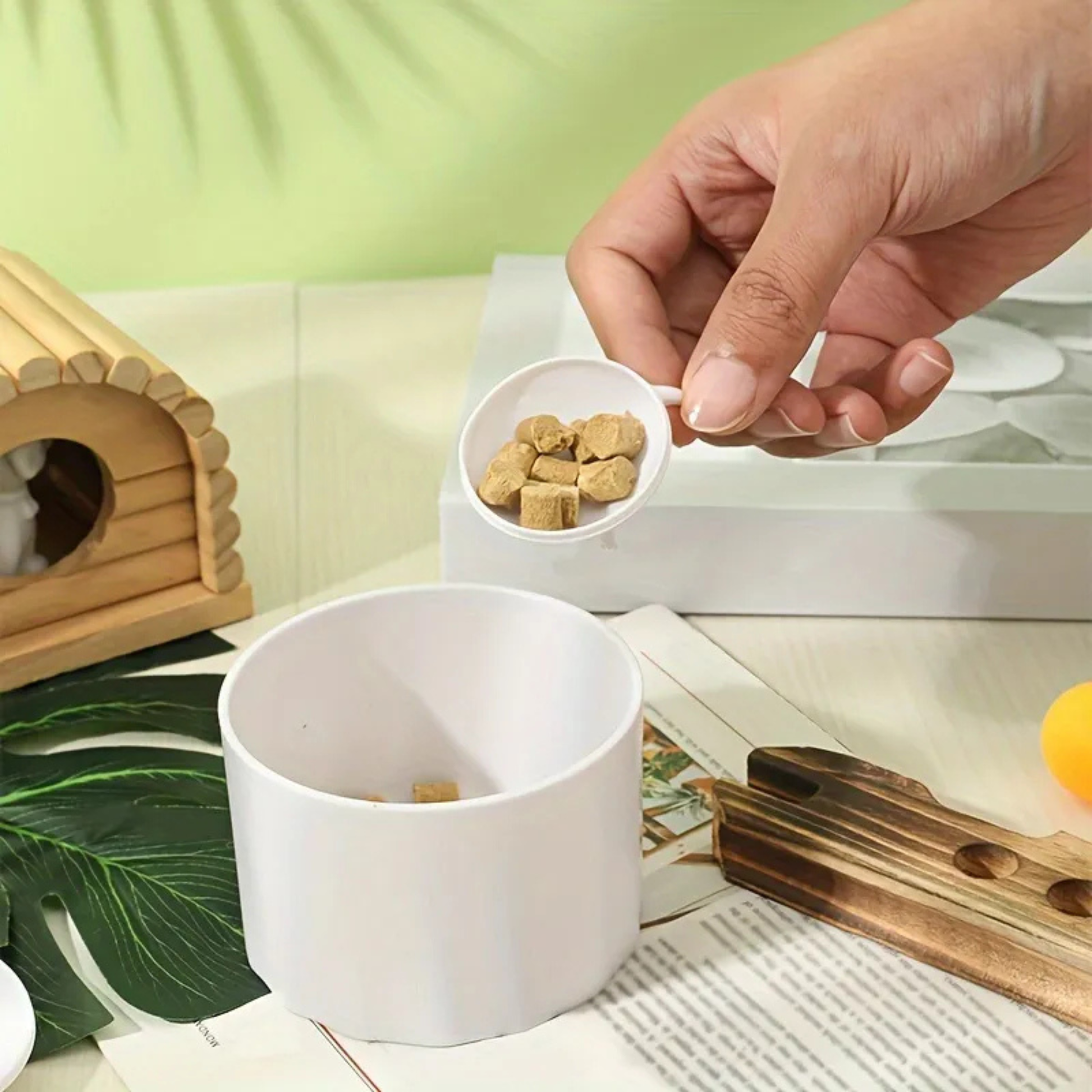 🥣 Contenedor blanco (parte central): Más amplio, perfecto para almacenar el alimento seco o incluso servir agua o alimento.