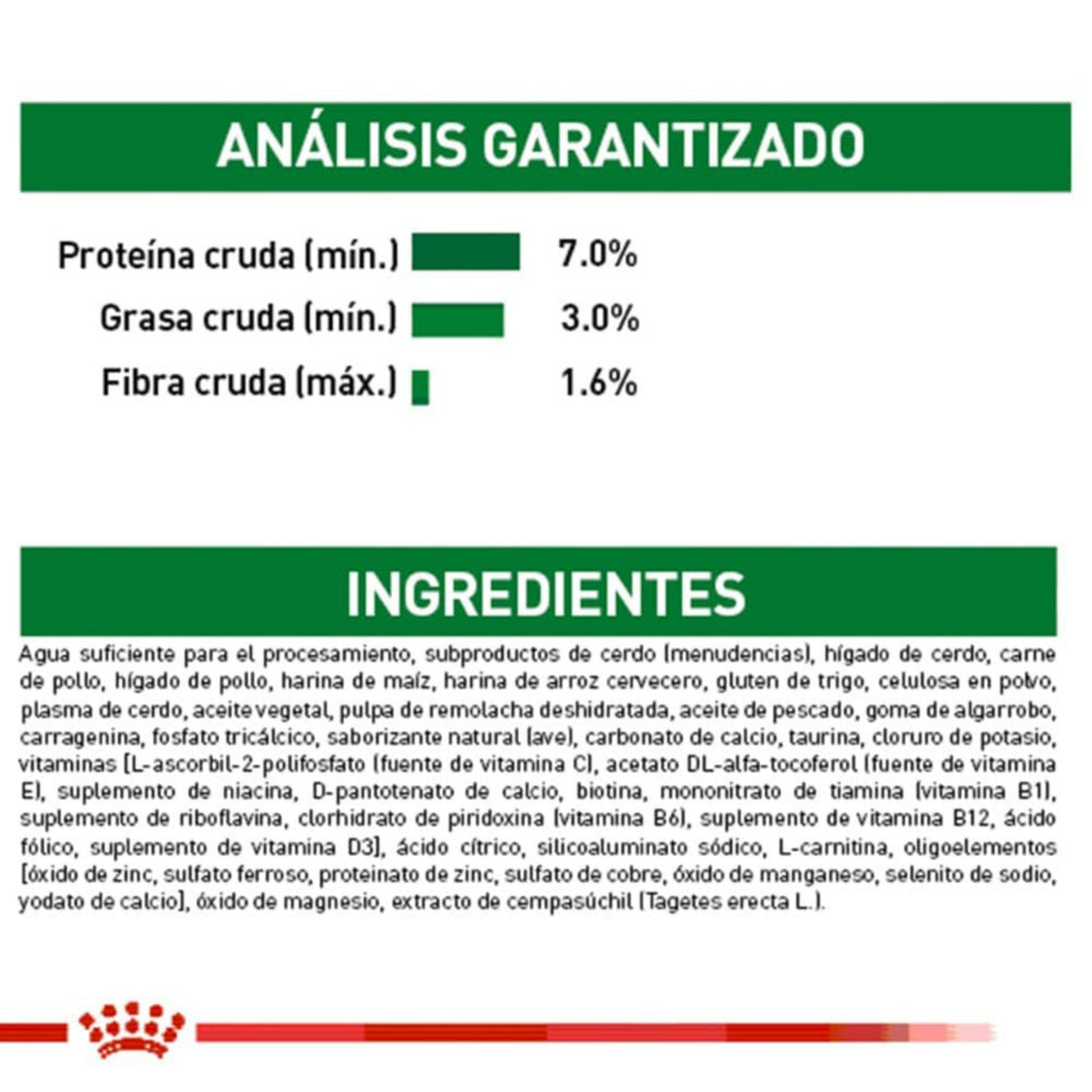 Ingredientes: Agua suficiente para el procesamiento, subproductos de cerdo, pollo, hígado de pollo, harina de maíz, harina de arroz, gluten de trigo, celulosa en polvo, pulpa pura de remolacha deshidratada, aceite vegetal, aceite de pescado, goma de algarrobo, carragenina, fosfato tricálcico, saborizantes naturales (ave), carbonato de calcio, taurina, cloruro de potasio, ácido cítrico, silicoaluminato sódico, L-carnitina, vitaminas [acetato de DL-alfa tocoferol (fuente de vitamina E), suplemento de niacina, L-ascorbil-2-polifosfato (fuente de vitamina C), biotina, D-pantotenato de calcio, mononitrato de tiamina (vitamina B1), suplemento de riboflavina, clorhidrato de piridoxina (vitamina B6), suplemento de vitamina B12, ácido fólico, suplemento de vitamina D3], oligoelementos (óxido de zinc, sulfato ferroso, proteinato de zinc, sulfato de cobre, óxido manganoso, selenito de sodio, yodato de calcio), óxido de magnesio, extracto de cempasúchil (Tagetes erecta L.)