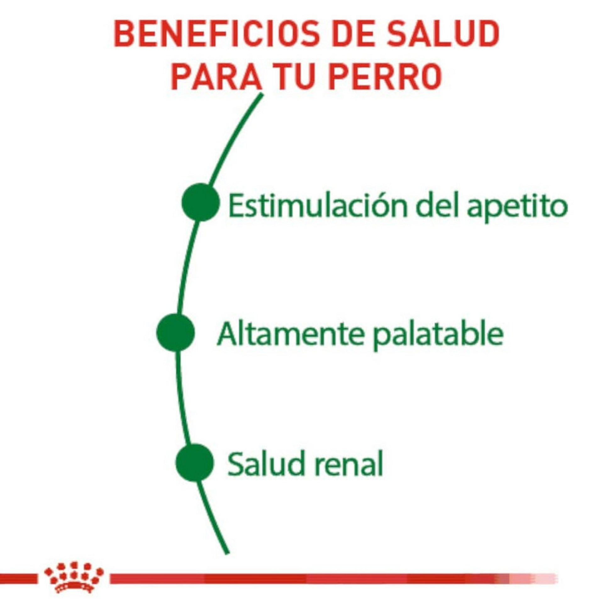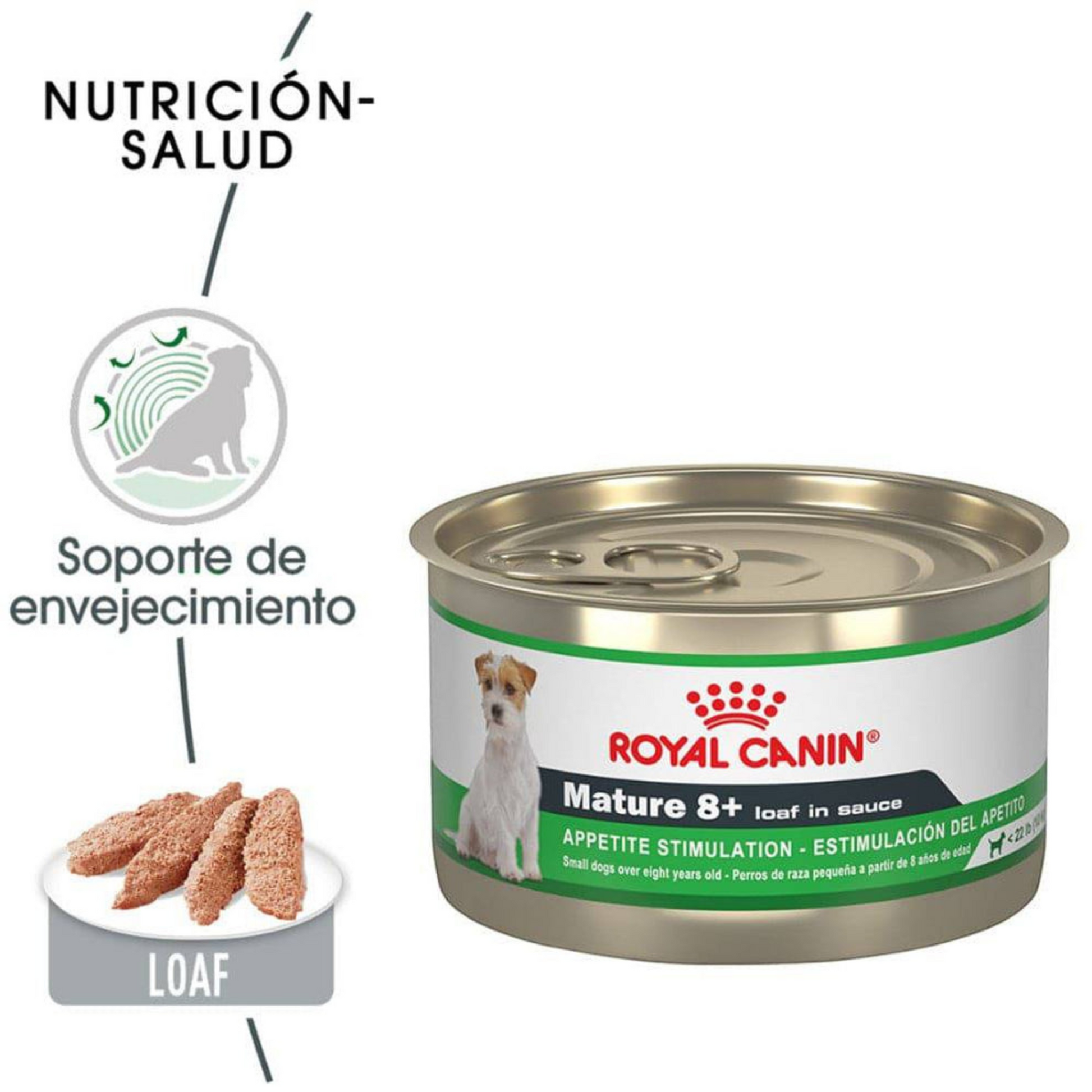 Royal Canin Wet Mature es un alimento húmedo para perros maduros a partir de los 8 años de edad. Estimula el apetito y da soporte del envejecimiento. Esta formulado con una combinación exclusiva de sabores y aromas naturales además de ser suave y fácil de masticar para ayudar a estimular el apetito del perro pequeño más viejo. Contiene un exclusivo complejo de antioxidantes.